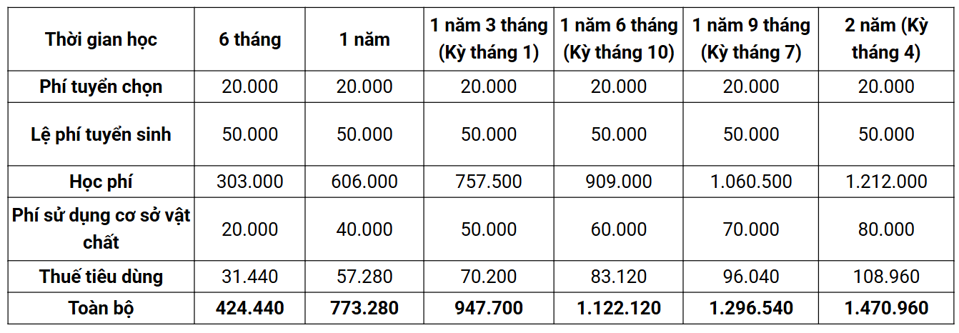- Các khóa học dài hạn được chia là 5 khóa chính gồm khóa: 2 năm, 1 năm 9 tháng, khóa 1 năm 6 tháng, 1 năm 3 tháng và khóa 1 năm với mục tiêu chính là: